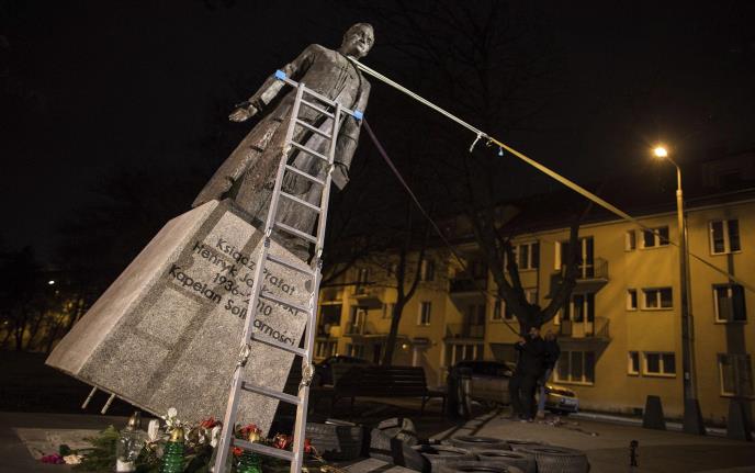 U petak aktivisti Solidarnosti nisu uspeli da ponovo postave spomenik jer su oko njega demonstrirale i pristalice i protivnici spomenika kontroverznom svešteniku.