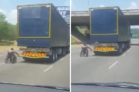 Naime, ispred njega je išao kamion, ali ono što mu je privuklo pažnju je muškarac u invalidskim kolicima koji se držao za prikolicu kamiona i tako se vozio.