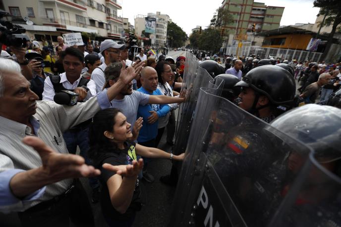 Policijske jedinice i članovi Nacionalne garde, koji su raspoređeni na pojedinima raskrsnicama u prestonici Venecuele, nose kacige, štitove i opremu za borbu protiv eventualnih sukoba u gradu.
