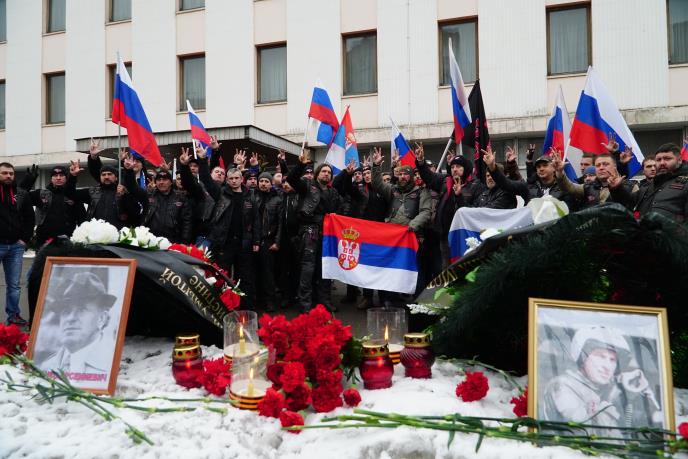 Bajkeri predvođeni Aleksandrom Zaldastanovim "Hirurgom" kod ograde srpske Ambasade položili su cveće, vence, a fotografije i snimci su objavljeni na društvenim mrežama.