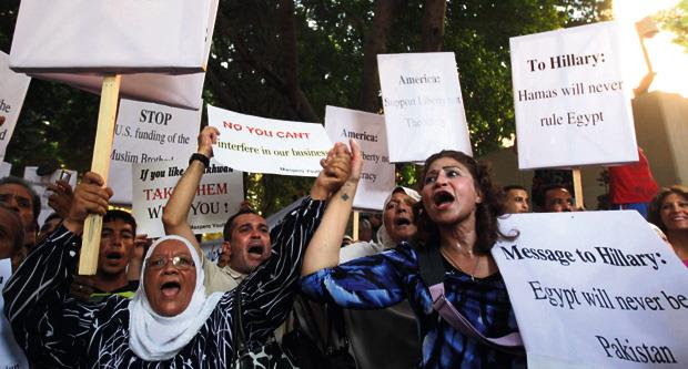 Egipćani su bacali truli paradajz, cipele i boce s vodom pri dolasku konvoja pod policijskom pratnjom u konzulat SAD, koji je Hilari posetila povodom njegovog ponovnog otvaranja nakon 1993.