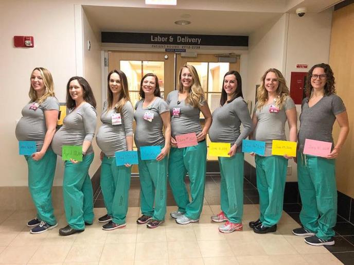 Bolnica je u ponedeljak objavila post na Fejsbuku, čestitajući medicinskim sestrama. Na fotografiji je prikazano osam od njih, na kojima se nalaze papiri sa datumima kada su zatrudnele.