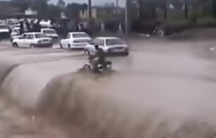 Jedan od snimaka koji se pojavio na internetu pokazuje motociklistu koji je mislio da će moći da prođe kroz bujicu, ali je pao sa motora i voda ga je odnela.