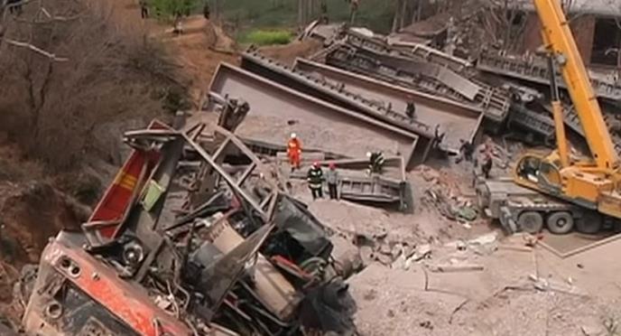 Fotografije prikazuju lokomotivu i 14 vagona ispod pruge, u podnožju delimično razorene zgrade.