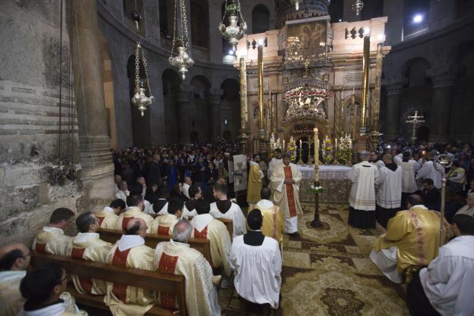 Rimokatolički nadbiskup Pjerbatista Picabala služio je misu u crkvi, podignutu na mestu na kojem je, po hrišćanskom verovanju, Isus razapet, sahranjen i vaskrsao, ukazujući na bol i nasilje i nadu rođenu u veri.