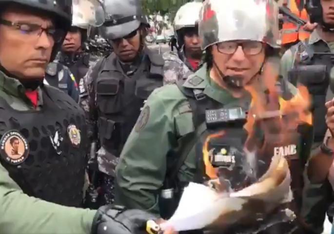 Pripadnik vojske Venecuele spalio je pismo lidera opozicije Huana Gvaida. Snimak je objavila televizija Telesur.