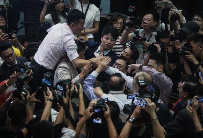 Tenzije sa početka sednice u parlamentu Hongkonga završile su se tučom, političari su počeli da psuju i skaču na stolove, a neki su pokušavali da se domognu mikrofona. Nekoliko poslanika je povređeno, a jedan je prebačen u bolnicu.