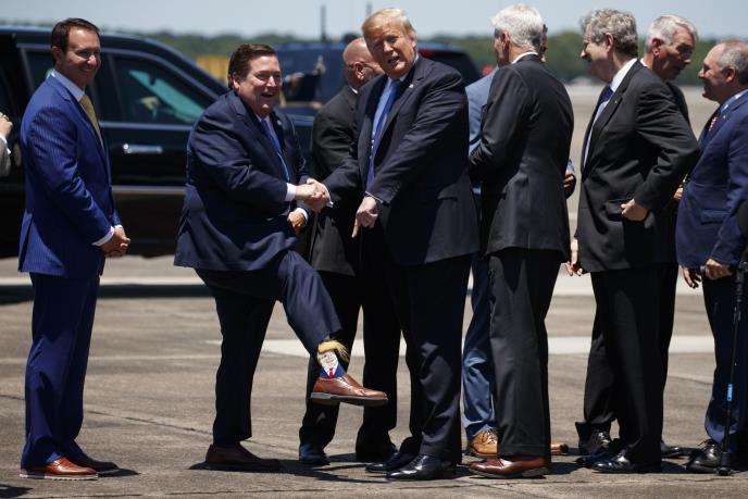Predsednik SAD Donald Tramp bio je oduševljen kada je stigao na jezero Čarls gde ga je dočekao guverner Luizijane Bili Nungeser koji je čarape sa likom američkog predsednika.