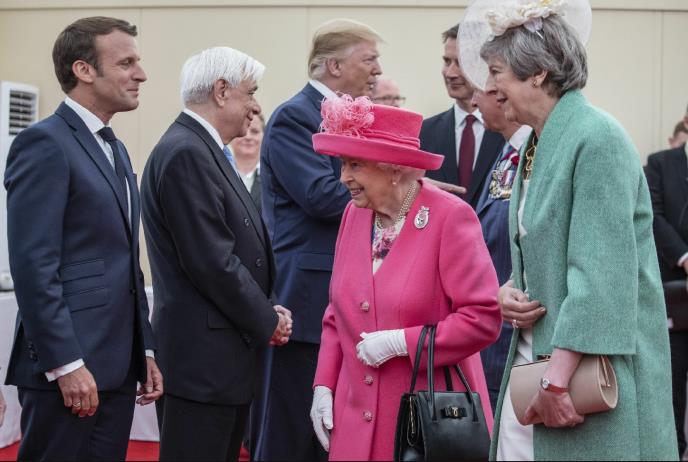 "Kraljicu je liderima predstavila premijerka. Svaki od njih predstavlja zemlju saveznicu koja je učestvovala u Danu D", piše na Tviteru uz snimak na kojem se kraljica rukuje i sa Angelom Merkel.