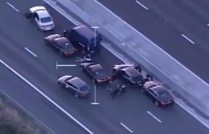 Snimci iz helikoptera prikazuju policajce koji zaustavljaju plavi kombi i još jedan automobil.