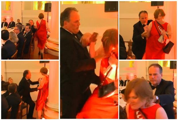 Obezbeđenje je uspelo da zaustavi neke aktiviste, koji su bili mirni, ali nekoliko devojaka je uspelo da uđe među goste. Jedna je prolazila pored stola za kojim je sedeo Fild, koji ju je udario, saterao u stub, grubo zgrabio, uhvatio za vrat i izgurao iz sale.