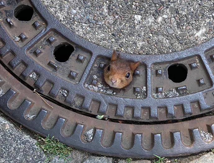 Kada su spasioci stigli, videli su kako glava veverice viri iz rupe na poklopcu šahta.