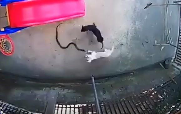 Psi su počeli da se bore sa zmijom, jedan ju je ujeo za rep, drugi za glavu.