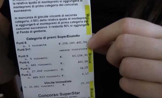 Najveći dobitak u istoriji italijanske popularne lutrije, SuperEnaloto, vredan 209 miliona evra izvučen je danas, a srećni tiket kupljen je u mestu Lodiju.