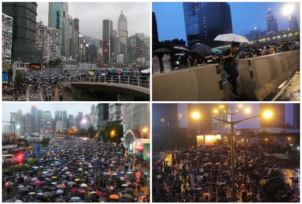Obilna kiša pala je danas na desetine hiljada demonstranata koji noseći kišobrane protestuju u Hongkongu.