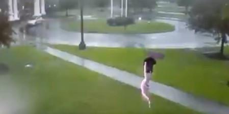 Kao što se može videti na snimku nadzornih kamera, grom je udario samo nekoliko centimetara od njegovih nogu što ga je nateralo da ispusti kišobran.
