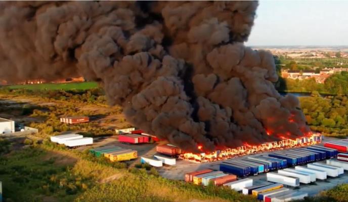 Ogroman požar zahvatio je desetine kamiona u fabrici veš mašina u Piterborou u Engleskoj, a eksplozije koje su odjekivale jedna z adrugom su se čule kilometrima daleko dok je džinovski oblak crnog dima prekrio grad.