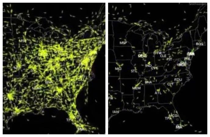 U samo 20 sekundi, od mape koja prikazuje nebo na SAD nalik na prepunu košnicu do potpuno ispražnjenog vazdušnog prostora.