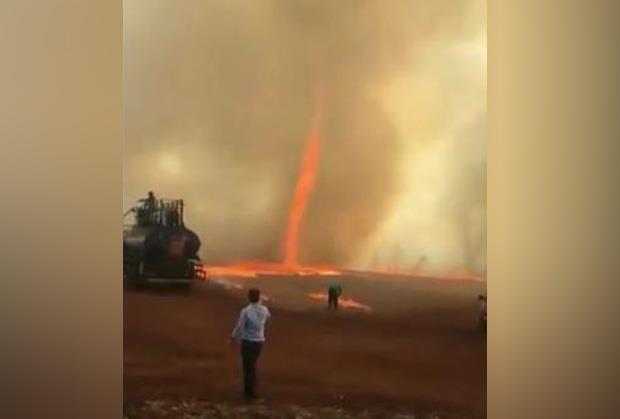 Na snimku se vidi kako plamen iznenada poprima oblik tornada pre nego što se provuče po zemlji i ostavi farmere u čudu dok se stub vatre kreće prema nebu, okružen dimom i eksplozijama.