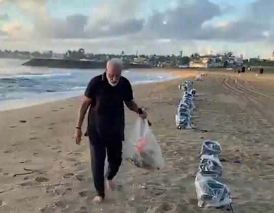 Modi je na svom Tviteru objavio kratak video u kome se vidi kako on bosonog po pesku sakuplja đubre sa plaže i stavlja ga u kesu, prenosi AP.