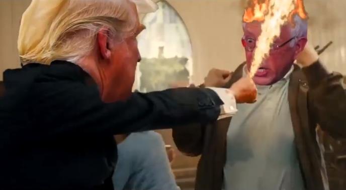 U svojevrsnoj parodiji, lažni Trump udara pokojnog senatora Džona Mekejna u vrat, zatim udara u lice i ubija televizijsku ličnost Rozi O'Donel, pali glavu senatora Bernija Sandersa, puca ili napada ljude čija su lica zamenjena logotipom novinskih kuća.