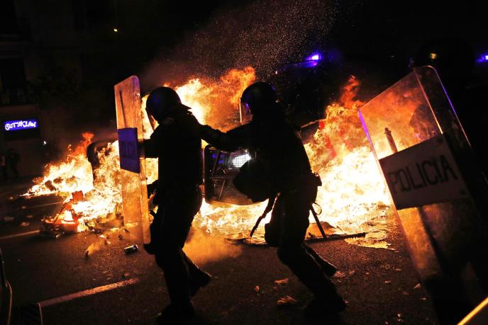 Policija za suzbijanje nereda ispalila je penasti gas, dok su demonstranti palili kontejnere i automobile u blizini odeljenja za unutrašnje poslove regionalne vlade u glavnom gradu Katalonije. Zbog vatre su blokirane najmanje četiri ulice.