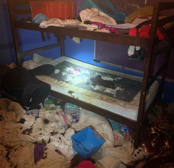 Na fotografijama koje je snimila policija, vidi se izmet na podu spavaće sobe i zaprljani dušeci, prljav frižider s pokvarenom hranom, kao i razbacano seno i kavezi po celoj kući.
