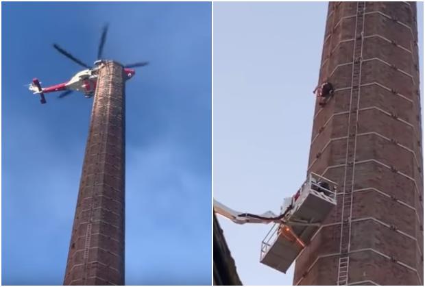 U pomoć je poslat i helikopter, a vatrogasci su podigli visoku platformu kako bi mogli da dođu do zaglavljenog sugrađanina.