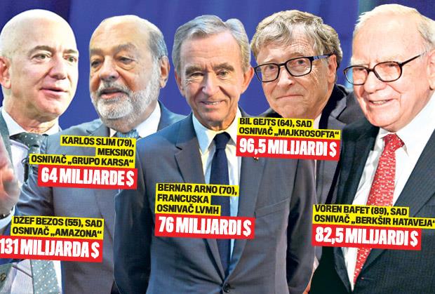 Najbogatiji čovek na svetu i dalje je Amerikanac Džef Bezos, a slede ga zemljaci Bil Gejts i Voren Bafet. Na listi pet najbogatijih su i Francuz Bernar Arno i Meksikanac Karlos Slim.