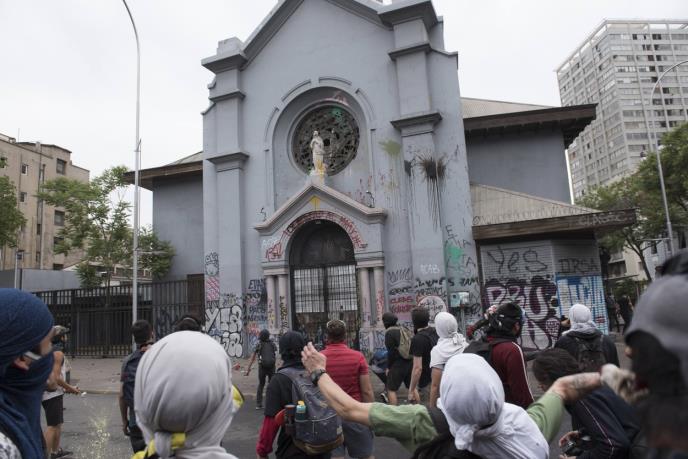 Demonstranti u Čileu, sa kapuljačama na glavama, vandalizovali su rimokatoličku crkvu Vaznesenja u blizini Trga Italija u Santijagu, glavnog stecišta protesta tokom protekle tri nedelje.