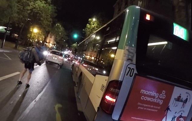 Video snimak snimljen na Ru de Tolbiak prikazuje odraslu osobu koja dete u plavom kaputu i bez kacige drži za grudi dok se kreće pored automobila.