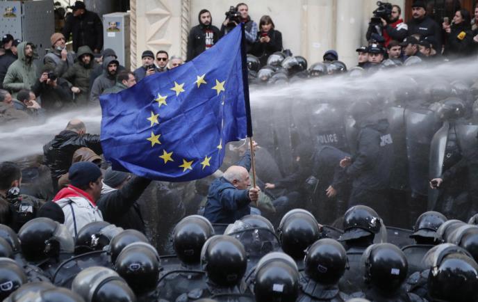 Jedan deo policijskih snaga za razbijanje demonstracija raspoređen je u glavnoj aveniji u Tbilisiju, dok drugi pokušavaju da spreče demonstrante da uđu u zgradu parlamenta.