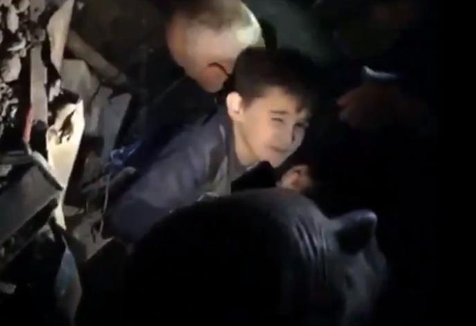 Dok muškarac drži jednog dečaka u naručju, izgleda kao da sa nekim razgovara ispod ruševina. Međutim, na snimku ne vidi da li je još neko zarobljen ispod.