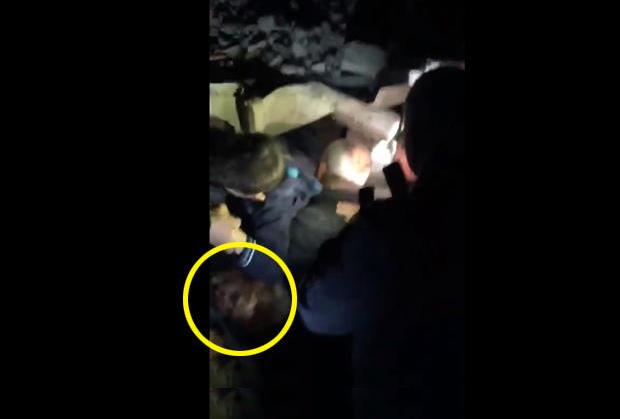 Donji deo tela deteta ostao je pod ruševinama, pa spasioci pokušavaju da mu pomognu.