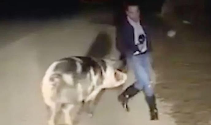 Svinja, za koju se veruje da je pobegla s obližnje farme, prvo mu je počela da njuška noge, zatim je počela da ga proganja i gricka reportera koji je bezuspešno pokušavao da umakne.