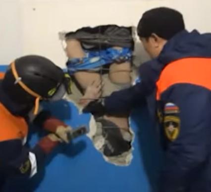 Ono što je bilo najčudnije, zvuci su dopirali iz zida u prizemlju. Kada su spasioci stigli na lice mesta, počeli su da ruše zid i unutra zatekli muškarca koji je visio naopačke u ventilacionom otvoru.
