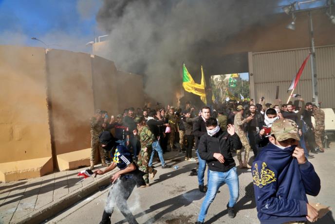 Američka vojska izvela je napad u nedelju protiv oružane grupe Kataeb Hezbolah u znak odmazde za ubistvo jednog američkog vojnog snabdevača prošle nedelje u raketnom napadu na iračku vojnu bazu. ; Masa je pokušavala da upadne u kompleks ambasade uzvikujući "Dole SAD". Nosili su žute zastave napadnute paravojne grupe i izazivali obezbedjenje ambasade, koje je stajalo iza staklenih prozora u prijemnom delu.