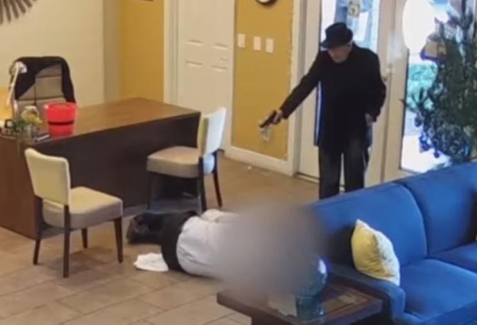 Zatim puca prema muškarcu, koji pada na tlo, a kasnije dolazi do njega i ispaljuje još jedan metak.