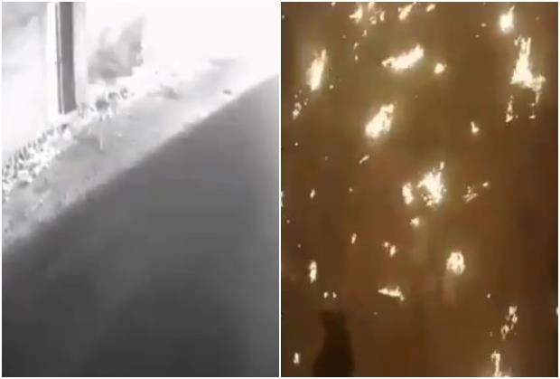 Prvo je osvetljeno tlo, a nešto kasnije vidi se odsjaj ogromne eksplozije i kako na zemlju padaju užareni komadi olupine.