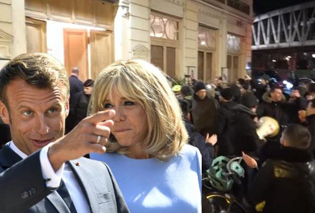 Policija za opremom za razbijenje demonstracija hitno je reagovala, a Makron i Brižit su hitno evakuisani iz pozorišta.