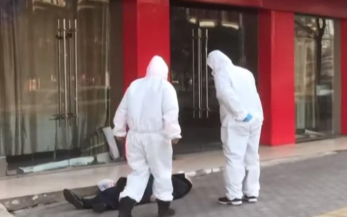 Policija u specijalnim odelima juče se okupila oko tela muškarca koji je pronađen mrtav na pločniku u Vuhanu, epicentru kineske epidemije virusa.