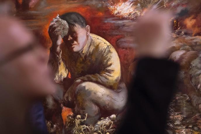 Slika koja je bila izložena u utorak prikazuje naizgled prestravljenog Hitlera, koji sedi među kosturima, pored mrtvog tela koje je ubodeno u leđa. Požari rata vide se u pozadini.