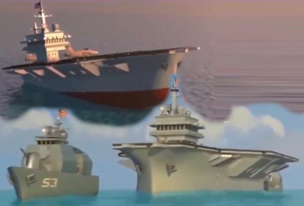 Snimak od minut i po snimak koji je emitovan u ponedeljak u polugodišnjem informativnom stavu, počinje pogledom na američki nosač aviona okruženom borbenim brodovima