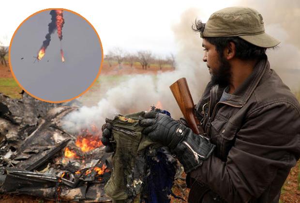Na fotografijama sa lica mesta pored olupine u plamenu stoje i naoružani neimenovani muškarci koji pokazuju delove izgorele uniforme zvanične sirijske vojske: