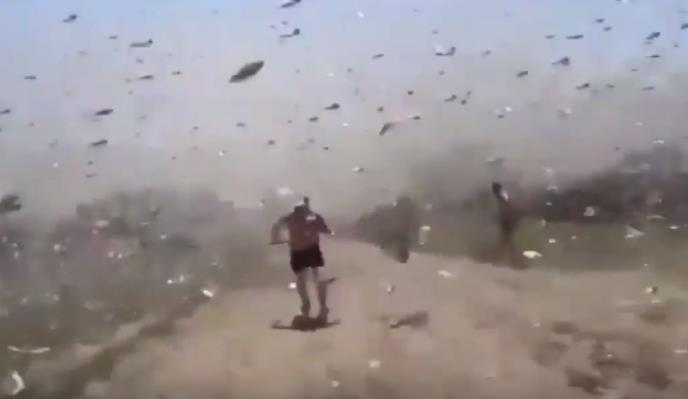 Prikazuje plavo nebo ispunjeno skakavcima koliko oko može da vidi. Pošast je poslednjih dana preletela Crveno more u Evropu i Aziju.
