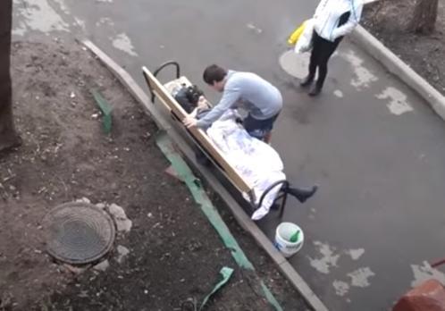 Na snimku nadzornih kamera, vidi se kako se Jelena Čuklova (48) previja od bolova na klupi, dok socijalni radnici i komšije pokušavaju da osiguraju pristup u zgradu.