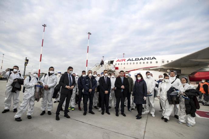 Mala ekipa albanskih lekara i drugog medicinskog osoblja stigla je u Italiju pre mesec dana i dočekana je salvama dobrodošlice. Ispratio ih je lično premijer Edi Rama i poručio Italijanima da je gest simboličan ali pokazuje da Albanija ne zaboravlja pomoć koju su u prošlosti često primali od Italije.
