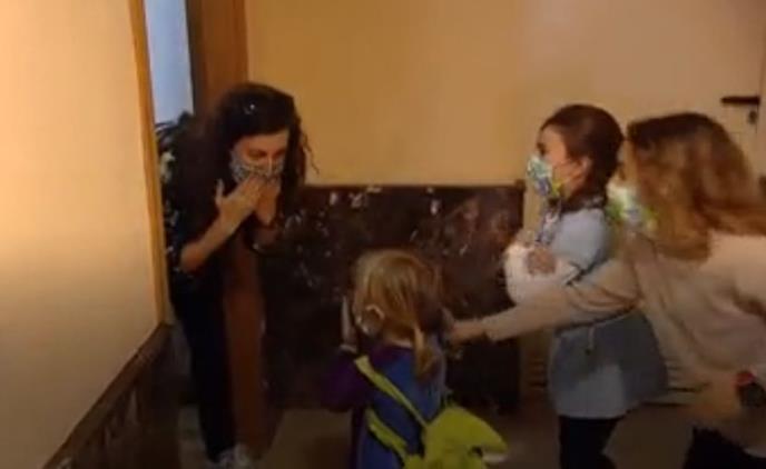 Na snimku koji je objavio BBC vidi se kako tetka dočekuje klince ispred vrata stana, ali ih ne grli. Svako od njih grli sam sebe, dok ne kriju oduševljenje na licu.