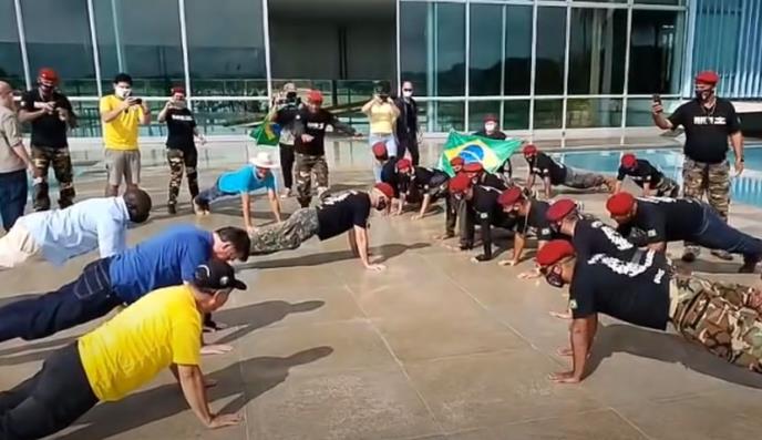 Muškarci, noseći maskirne pantolone, crne majice s natpisom "Bolsonaro" i crvene beretke, ispruživši desnu ruku, zakleli su se na vernost predsedniku i njegovoj porodici, a potom mu se pridružili u seriji sklekova.