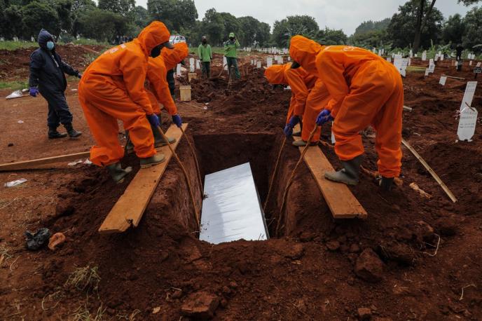 Oko 50 grobara na groblju Pondok Rangon - jednom od dva mesta koja su namenjene za sahranjivanje žrtava Kovida-19 u indonežanskoj prestonici, rade i po 15 sati dnevno, sedam dana u nedelji, za mesečnu zaradu od 290 američkih dolara (265 evra).